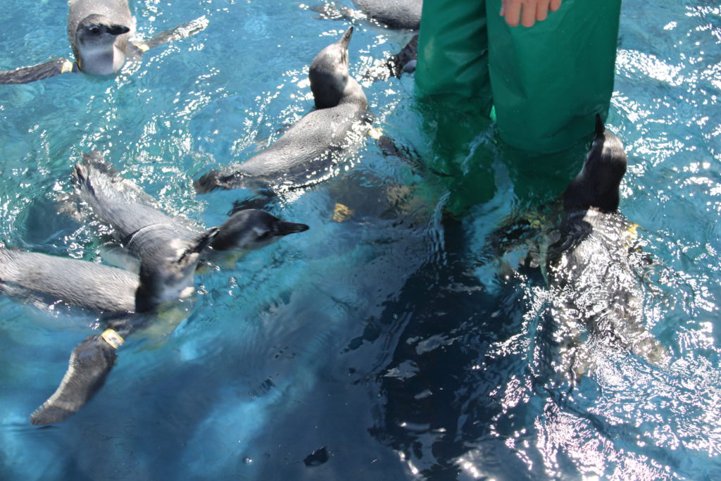 Danach ging es aber auch wieder sehr schnell an die Arbeit, denn unsere Patienten wollten Aufmerksamkeit, Essen und ein sauberes Umfeld haben. Janet hatte sich eine Handbürste unter Ihren Fuß geschnallt und damit den Südpool gesäubert. Die kleinen Pinguine fanden das wohl sehr interessant und waren nahe am Geschehen: