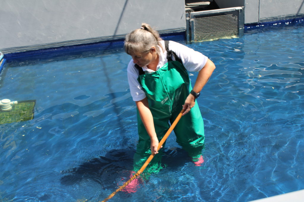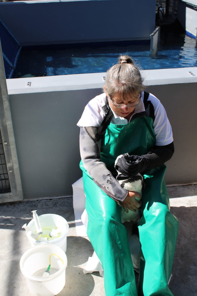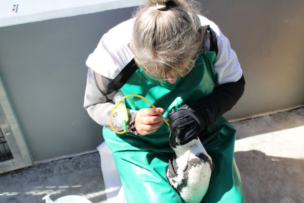 Bevor wir jedoch mit der täglichen Routine beginnen konnten, musste zunächst ein Check-Up von allen Pinguinen durchgeführt werden. Das gestaltete sich zunächst als sehr schwierig, da die Tore zum Pool ALLE geöffnet waren über Nacht und entsprechend die Pinguine von 3 Pens bunt gemischt waren. Was für ein Durcheinander. Gerne habe ich geholfen Gewicht, Augen, Schnabel, grundsätzliche Kondition, Gefieder und Füße zu untersuchen – ich habe eher alle Pinguine festgehalten und der Arzt hat untersucht. Wie immer war der Kampf mit der Waage eine Herausforderung, da nur eine von drei Waagen heute funktionierten.