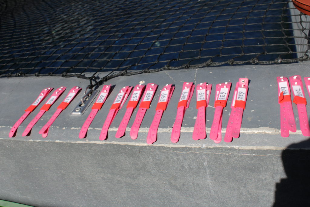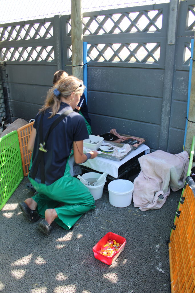 Da wir so gut Hand in Hand gearbeitet haben, waren wir sehr schnell mit unserer Arbeit fertig und konnten im Nachbar-Pen aushelfen. Hier mussten alle Nummernschilder der Pinguine ersetzt werden, da sie zum Teil unlesbar waren. Gleichzeitig wurden die Pinguine gefüttert und mit Medikamenten versehen, auf dass sie nicht zu lange zwischen den Beinen der Menschen sitzen mussten. Das war Akkordarbeit, da die Tags noch nicht mit den roten Klebestreifen als Zeichen von 1-Stunden-Schwimmer versehen waren und dies auch noch erledigt werden musste.
