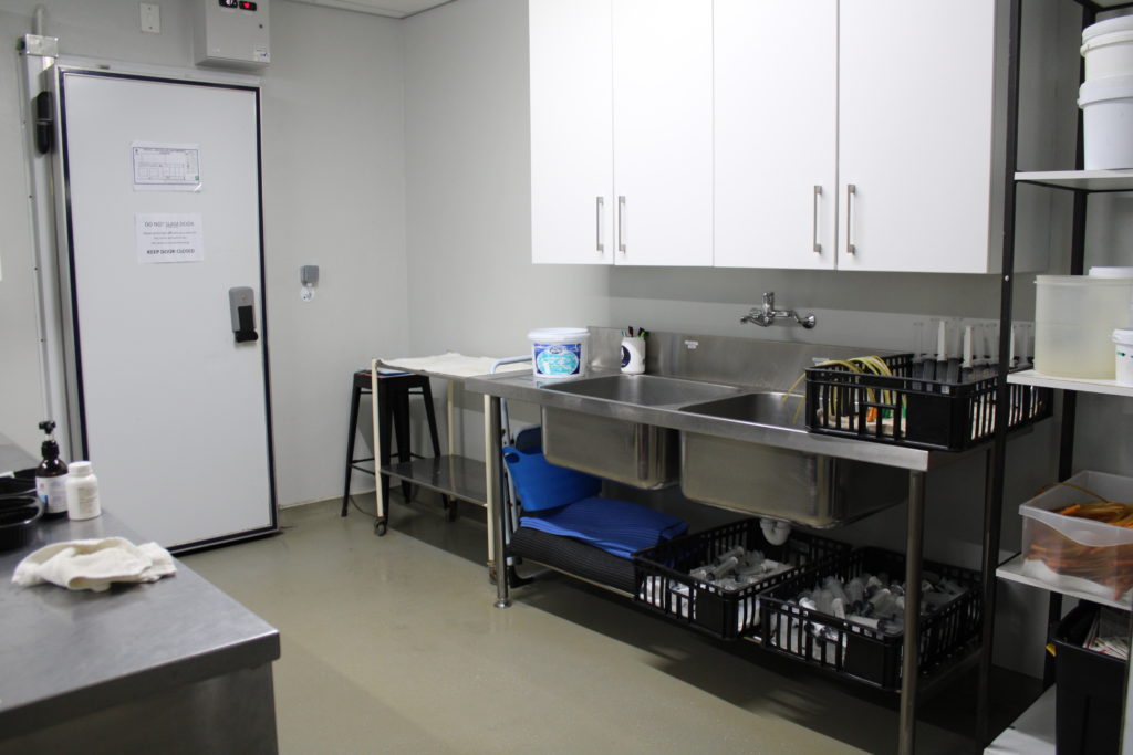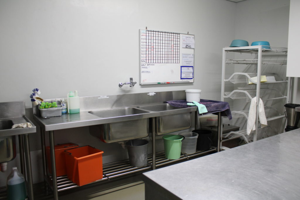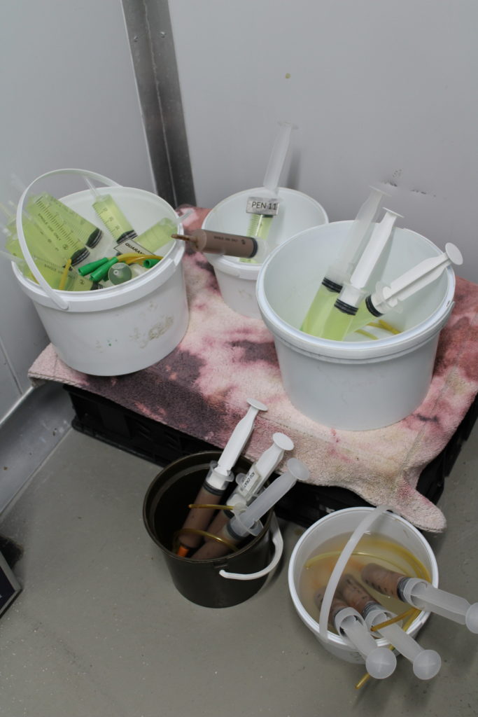 Auf dem Whiteboard muss jeder Verantwortliche aus jedem Pen / Einheit (Quarantäne, Nursery, etc) aufschreiben wie viele Fische, Darrows (Elektrolyte), Formular (Nährlösung) und Fischschwänze er zu welcher Uhrzeit benötigt. Darrows und Formular haben eine Haltbarkeit von 24 Stunden und sollten daher immer in ausreichender Menge aber auch nicht über den Bedarf erstellt werden.