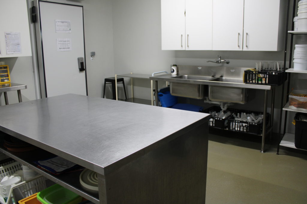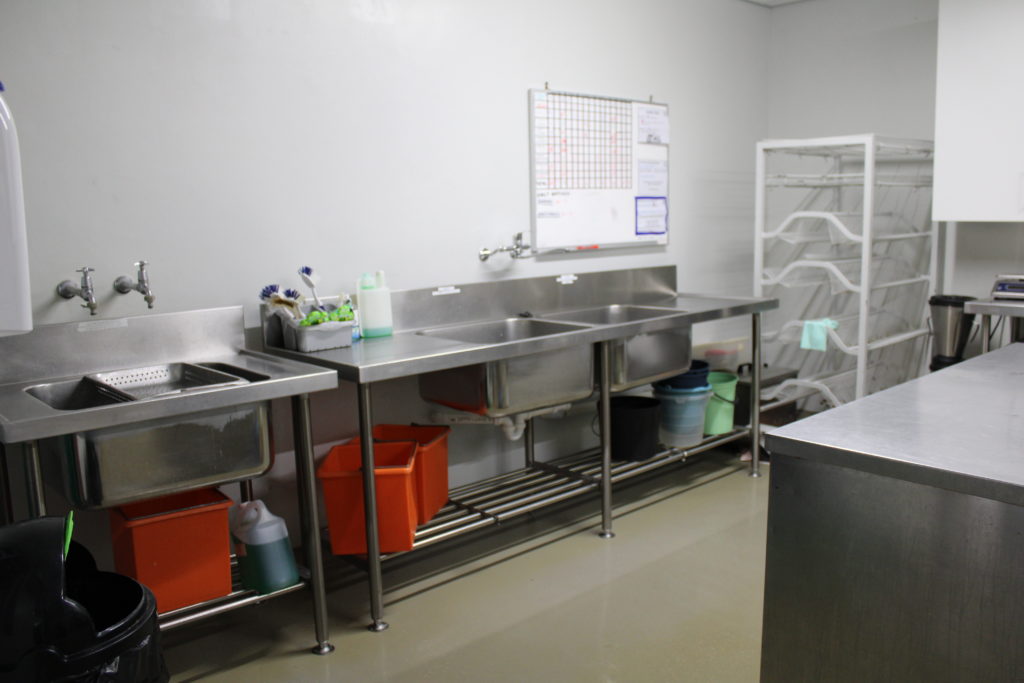 Morgens ist es hier noch recht friedlich. Aber dann kommen sie alle auf ein Mal, denn alle Patienten werden gleichzeitig gefüttert. Dann ist hier die Hölle los. Auf dem Tisch in der Mitte wird um jeden Zentimeter gekämpft, das dreckige Geschirr stapelt sich, bis alle Essen vorbereitet sind. Dann kann kurz durchgeatmet werden, bevor die benutzten Utensilien und Spritzen zurück gebracht werden. Jetzt beginnt der Abwaschstress. Und so geht es den ganzen Tag weiter. Zwischendurch muss neues Formular und neues Darrow hergestellt werden und die Küche sauber gehalten werden.