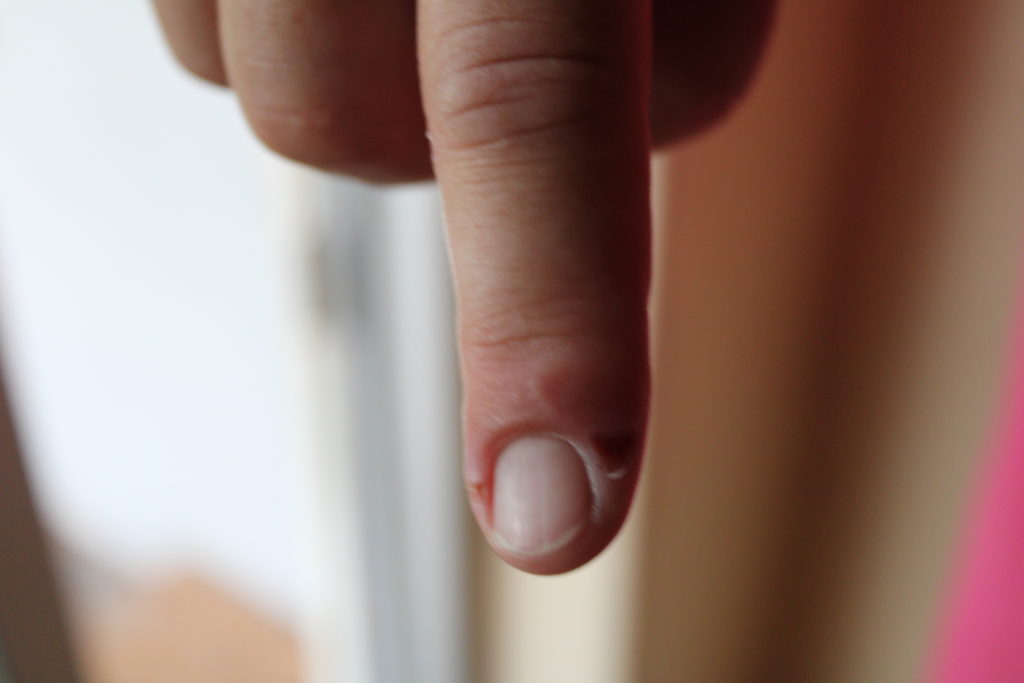 Der ganze Finger ist geschwollen. Die Spitze knall rot und das Loch mit dem herausgebissenen Stück Menschenfleisch ist deutlich zu erkennen. Mals sehen wie es verheilt.
