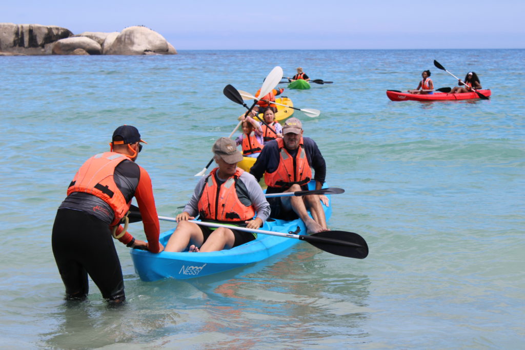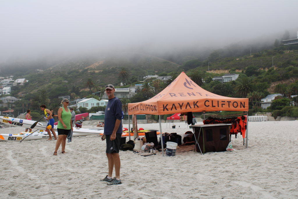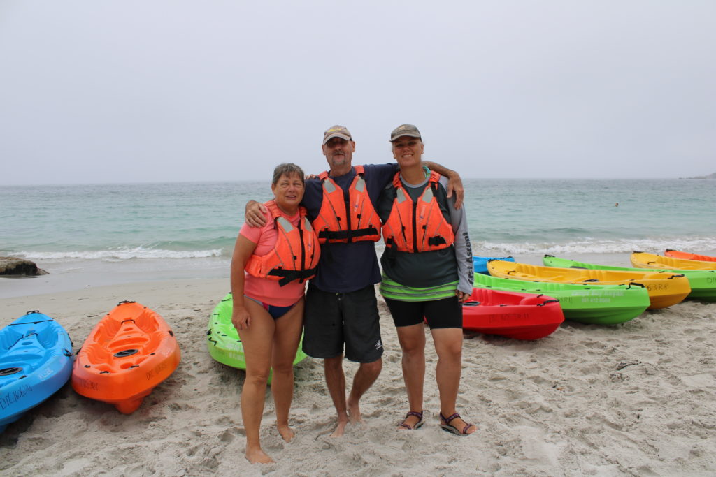 Wir sind 1,5 Stunden gemütlich gefahren, so dass auch die Anfänger aus der Gruppe (13 Teilnehmer) Spaß und Freude an der Tour hatten. Zunächst rechts um einen Felsen herum an einem Ende von Cliffton, und dann links zum anderen Ende von Cliffton, an einem Felsen vorbei, auf dem Komorane gesessen haben. Hier konnten wir schwimmen und sind anschließend gemütlich zum Strand zurück gepaddelt.