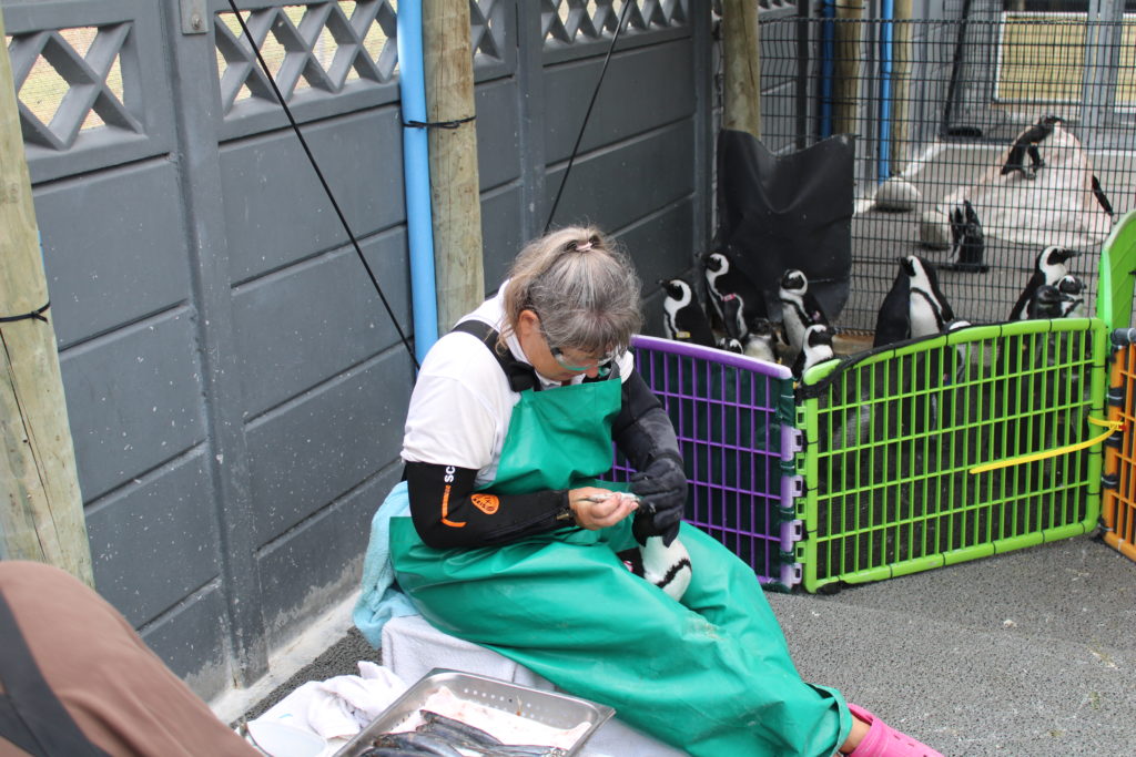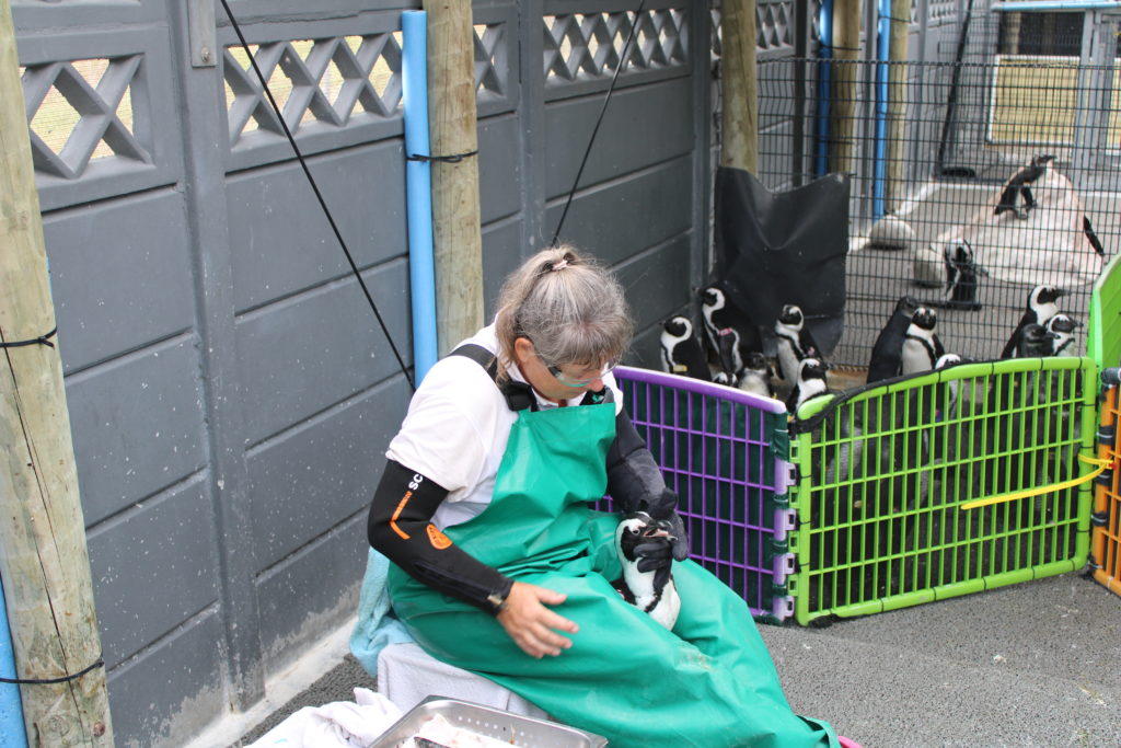 Und es war ein volles Programm. Zuerst mussten alle Pinguine gewogen werden. Danach bekamen 5 Patienten ihr Darrows verabreicht, bevor wir mit dem Frühstück begonnen haben. Danach wurden ein paar Pinguine auf ein Upgrade hin untersucht und später noch mal eine Visite durchgeführt. Zwischendurch wurden zwei Pens gesäubert und das Abendessen vorbereitet.